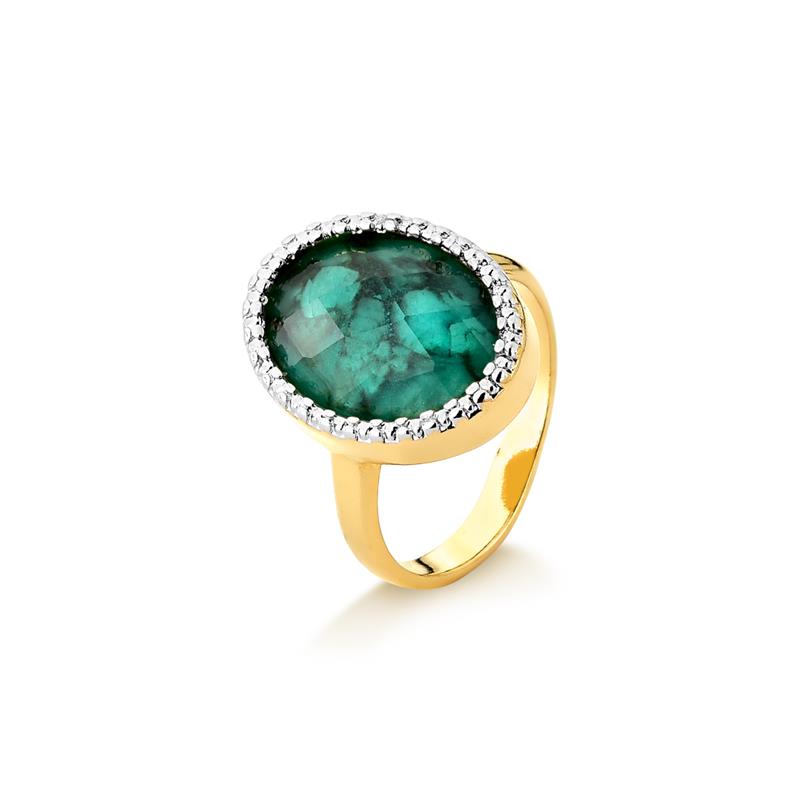 COLEÇÃO ESMERALDA. Anel com pedra de Esmeralda sobreposta por um cristal lapidado, no formato oval 10X14mm. Possui textura similar a zircônia, com aplicação de ródio branco.