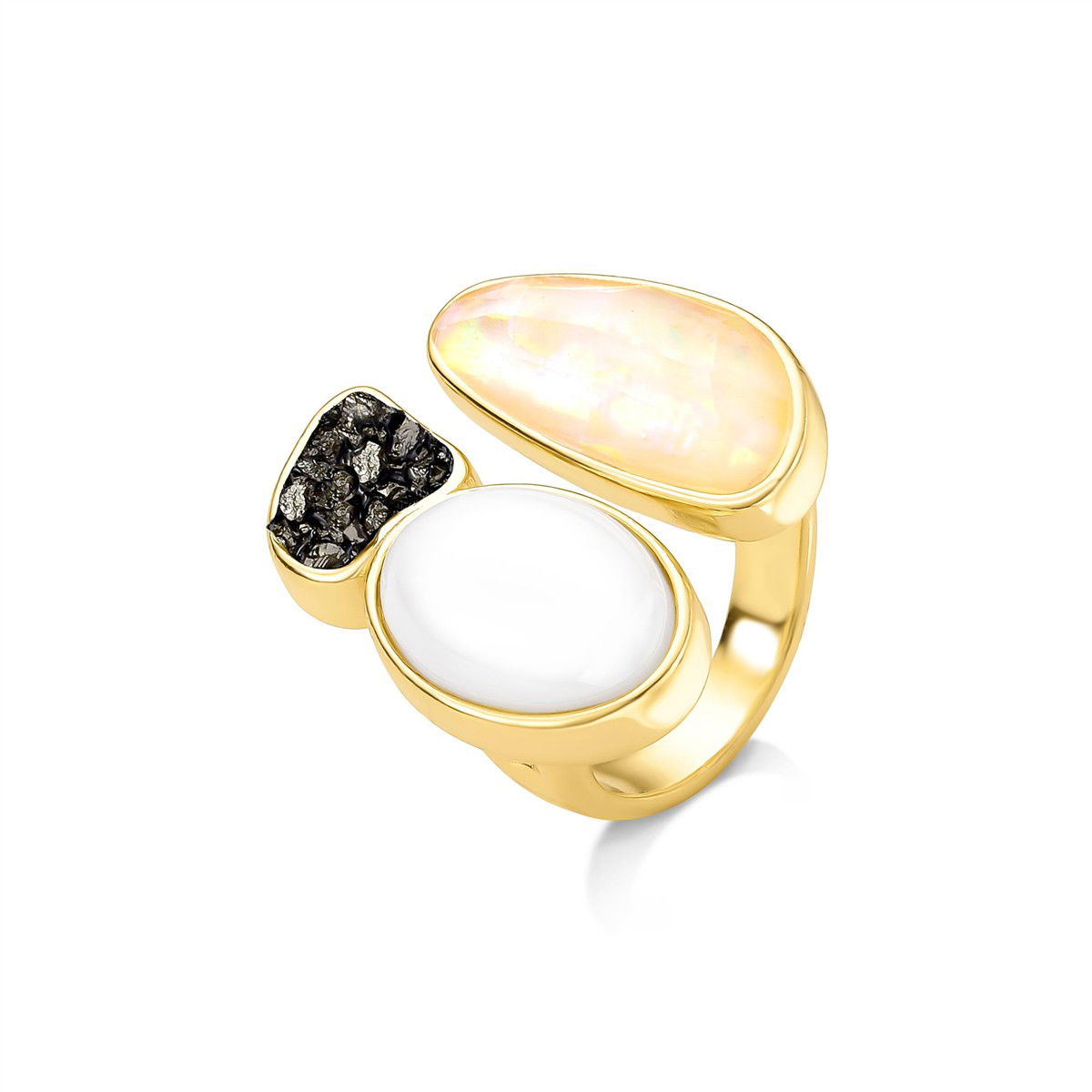 A Coleção Aura traduz a essência do boho chic em uma leitura moderna. Peças em porcelana perolada se unem a concha nautilus e pedras fragmentadas, refletindo luz e texturas em formatos orgânicos.