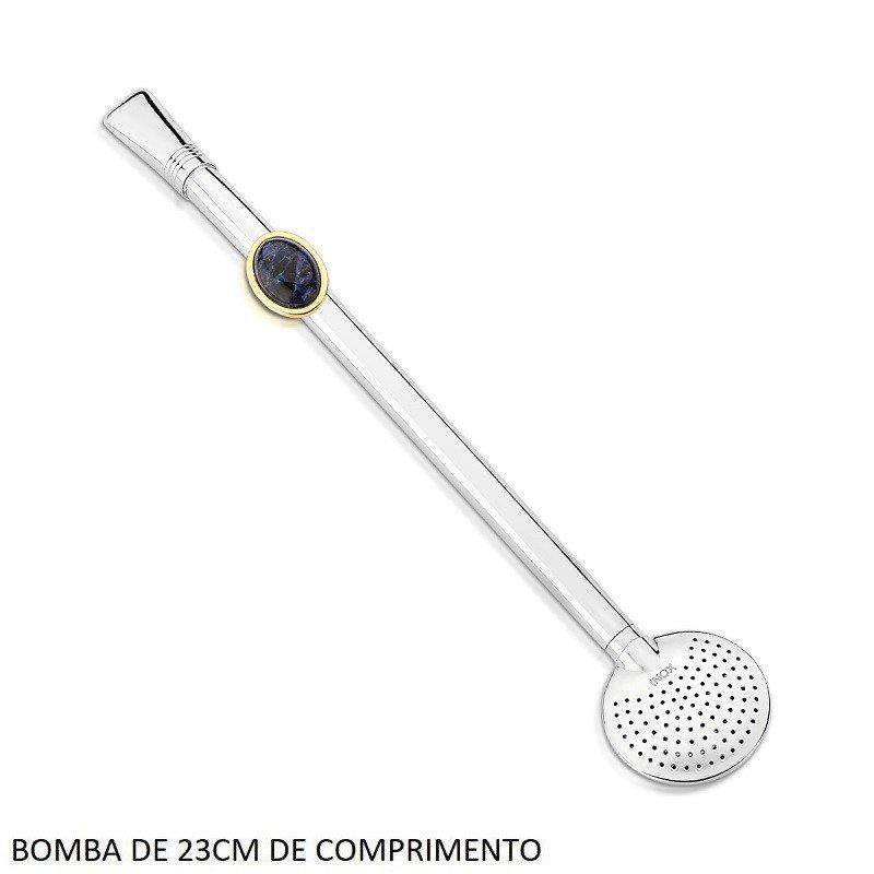 LINHA TRADIÇÃO. Bomba de chimarrão de 23cm, em aço inox, com detalhe folheado a ouro com pedra cabochão em formato oval de 14x19mm. Acompanha caixinha e escova para limpeza da bomba.