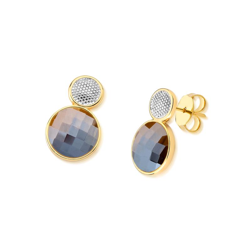 COLEÇÃO FACETADA PEROLADA. Brinco com pedra natural facetada, com efeito perolado, no formato redondo de 12mm. Possui detalhes com aplicação de caneta de ródio branco. Altura total da peça: 2,4cm.