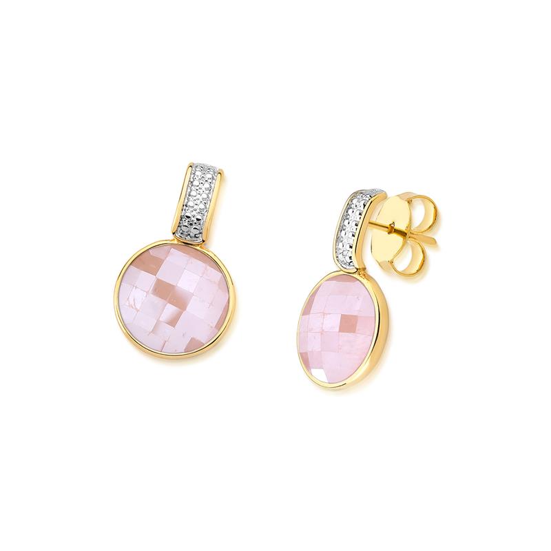 COLEÇÃO FACETADA PEROLADA. Brinco com pedra natural facetada, com efeito perolado, no formato redondo de 12mm. Possui detalhes com aplicação de caneta de ródio branco. Altura total da peça: 2,5cm.