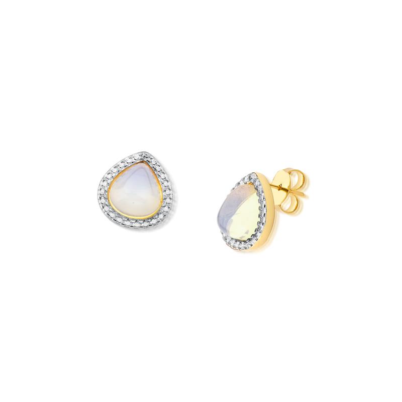 LINHA BÁSICA, Brinco com pedra cabochão no formato de gota 8,65mm, possui textura similar a zircônia, com aplicação de ródio branco. Altura total do brinco: 1,3cm.