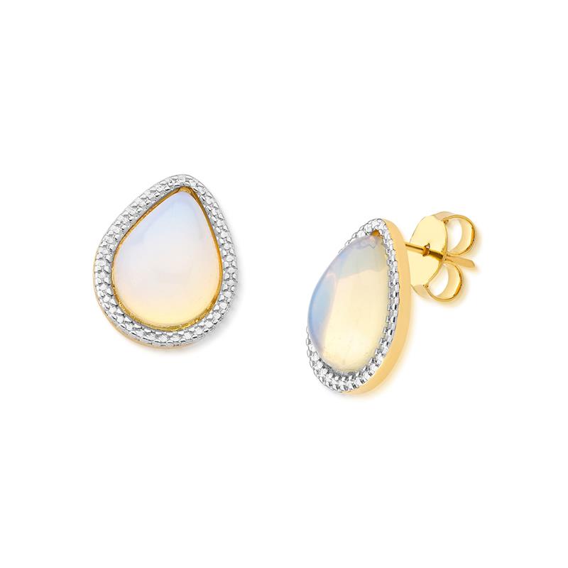 LINHA BÁSICA. Brinco com pedra cabochão no formato de gota 10x14mm. Possui textura similar a zircônia, com aplicação de ródio branco. Altura total do brinco: 2cm