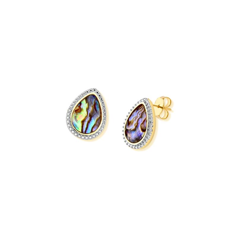 COLEÇÃO CONCHAS. Brinco com pedra de concha sobreposta por um cristal facetado, no formato de gota 10x14mm. Possui textura similar a zircônia, com aplicação de ródio branco. Altura total do brinco: 1,8cm.
