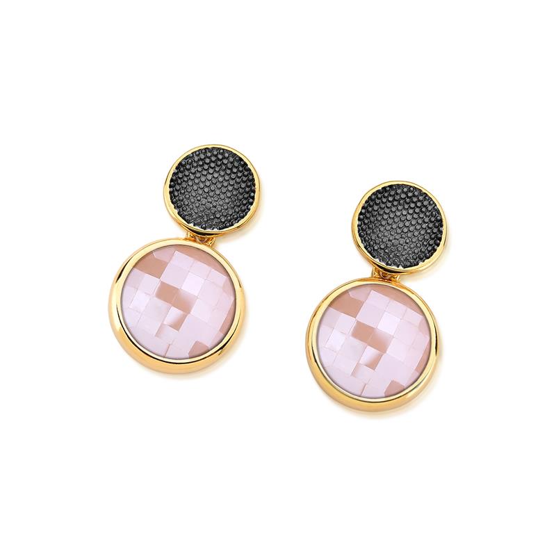 COLEÇÃO FACETADA PEROLADA. Brinco com pedra natural facetada, com efeito perolado, no formato redondo de 12mm. Possui detalhes com aplicação de caneta de ródio negro. Altura total da peça: 2,7cm.