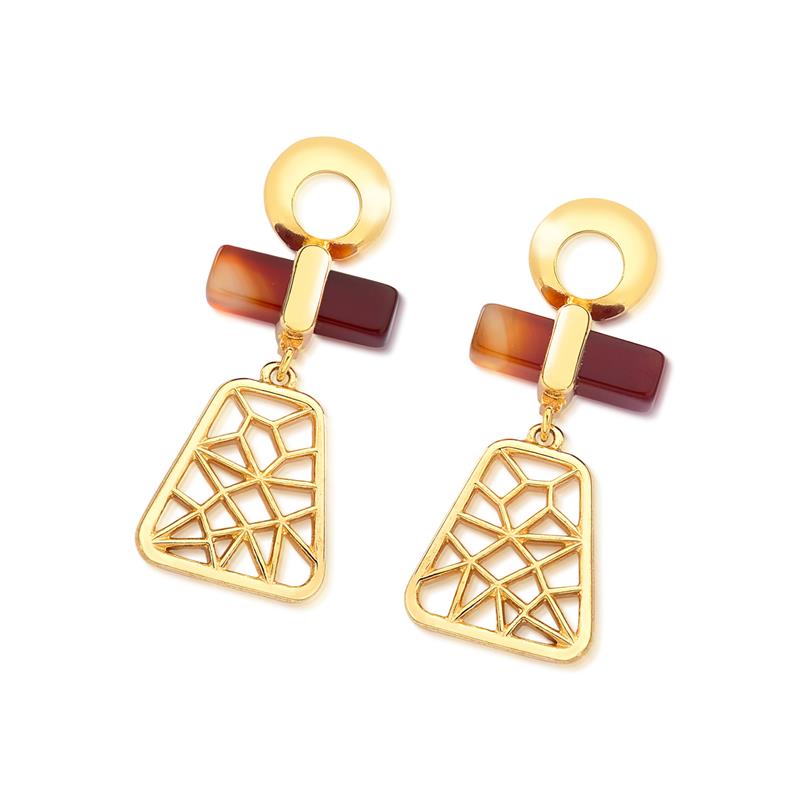 COLEÇÃO TRAMA. Brinco com pedra retângulo de chapa 18x5mm. O brinco possui a base em formato redondo, a pedra ao meio e para finalizar uma franja com detalhes em formato de trama. Altura total do brinco: 4cm.