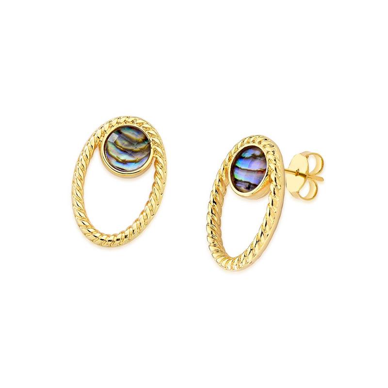COLEÇÃO CONCHAS. Brinco com pedra de concha sobreposta por um cristal facetado, no formato redondo de 8mm. Possui detalhes vazados que acampanham o desenho do metal. Altura do brinco: 2,6cm.