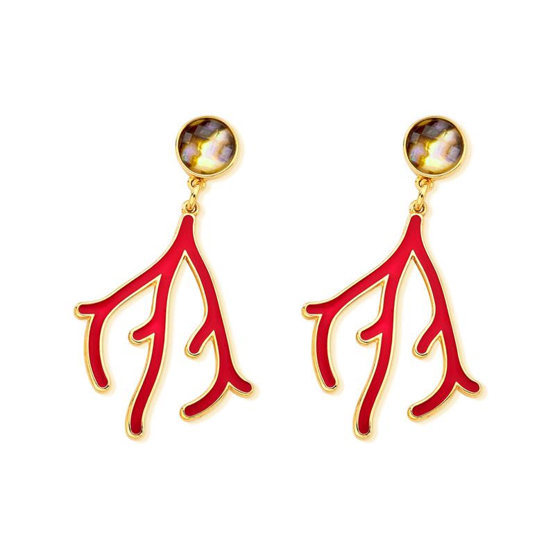 COLEÇÃO MARÉ. Brinco com pedra de concha sobreposta por um cristal facetado, no formato redondo de 10mm. Possui detalhe pendente em formato de coral com aplicação de resina vermelha. Altura total do brinco: 6cm