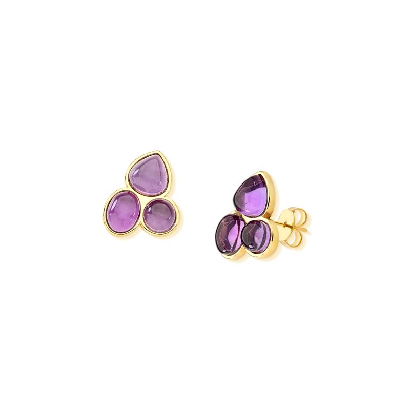 COLEÇÃO AMETISTA.Brinco com 3 pedras cabochão no formato oval 8x6mm, redonda 6,5mm e gota 8,65mm.