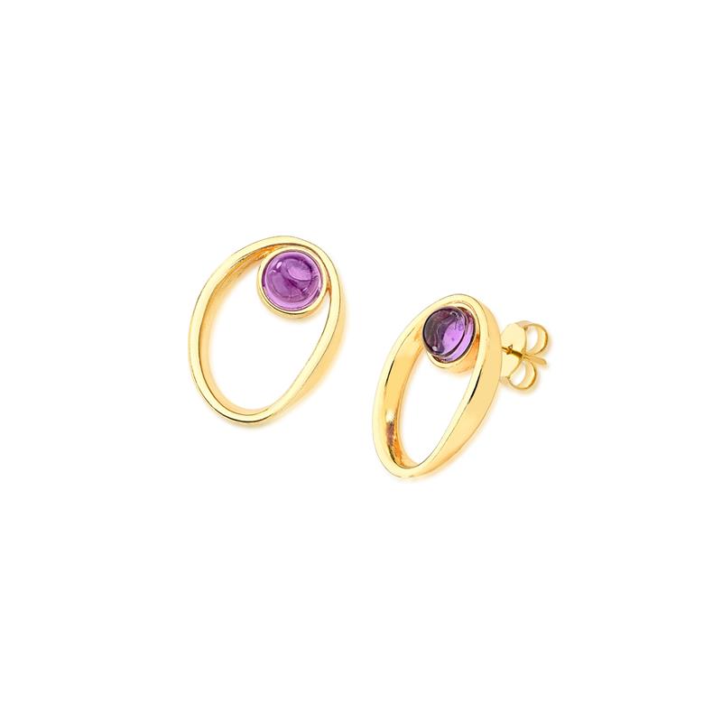 COLEÇÃO AMETISTA.Brinco com pedra cabochão, no formato redondo de 6,5mm.