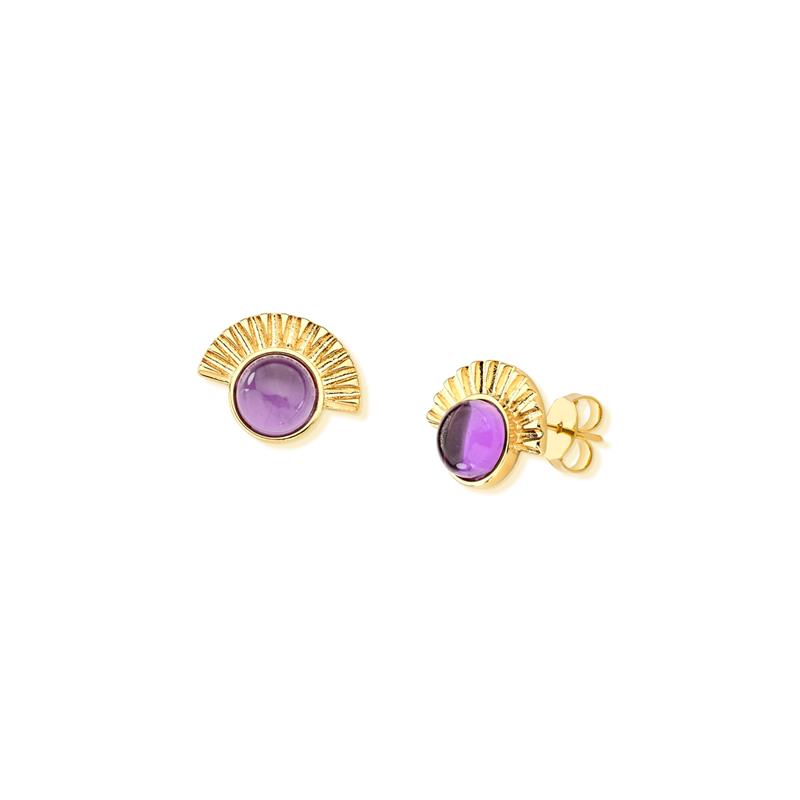 COLEÇÃO AMETISTA.Brinco com pedra cabochão, no formato redonda de 8mm. Possui metais com texturas em seu entorno, tranformando-se em uma peça moderna e cheia de estilo!