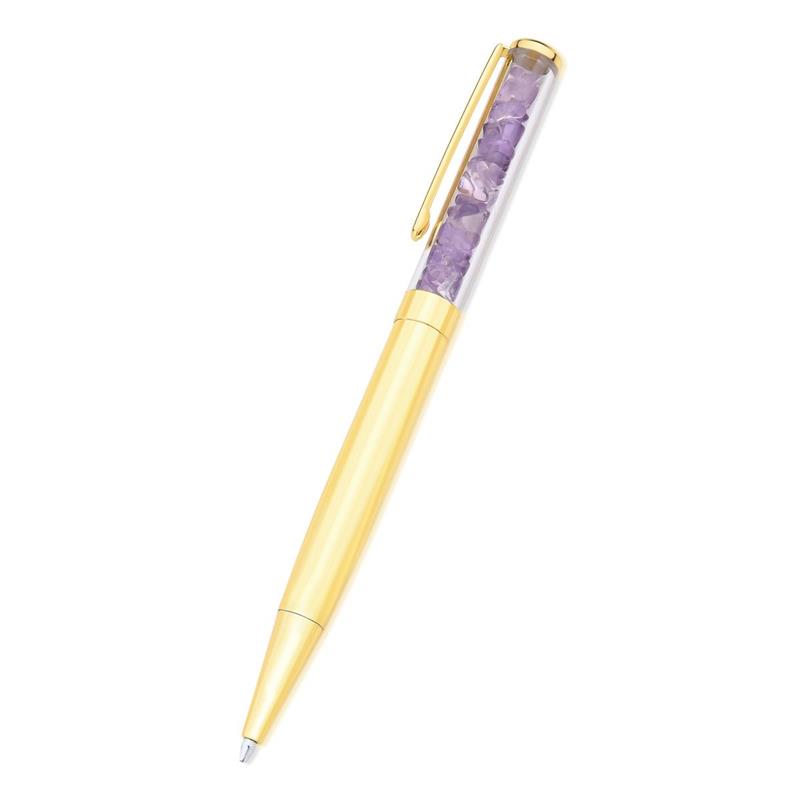 LINHA BEM ESTAR.Caneta esferográfica de tinta azul com pedras naturais em formato cascalho. Com acabamento dourado é uma peça ideal para presentear e ter a energia das pedras naturais em suas mãos. Acompanha embalagem em acrílico transparente e etiqueta com QRcode para mais informações sobre o produto. É possível substituir a carga da caneta.