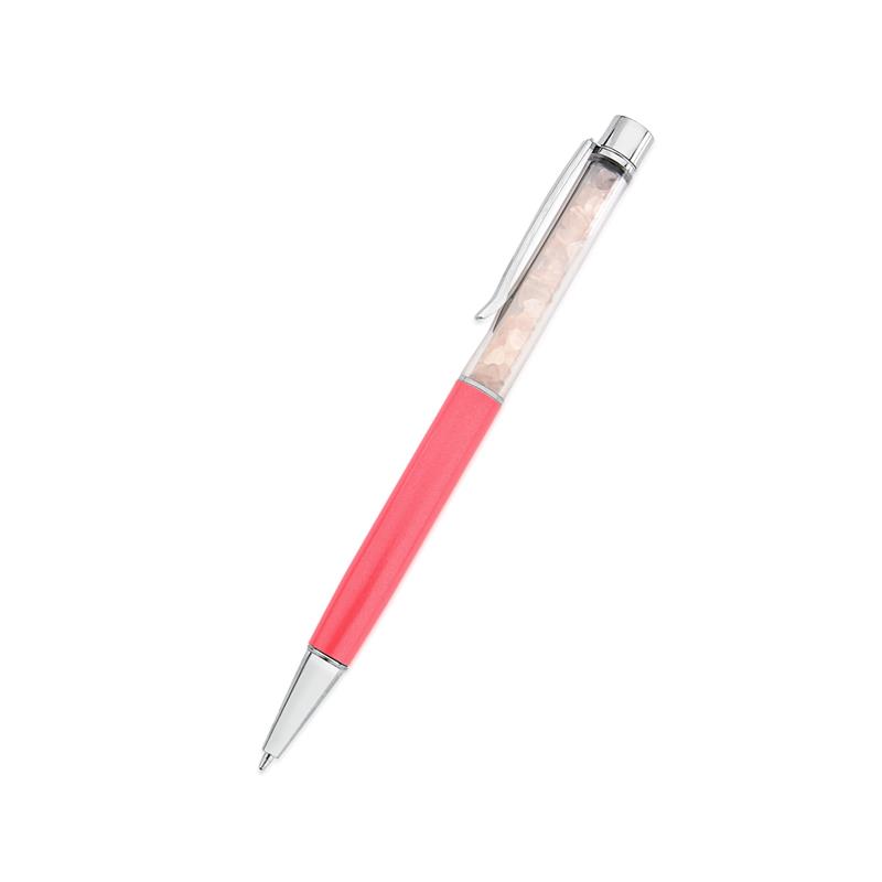 LINHA BEM ESTAR.Caneta esferográfica de tinta preta com pedras naturais em formato cascalho. Com acabamento cromado e tubo salmão. Uma peça ideal para presentear e ter a energia das pedras naturais em suas mãos. Acompanha embalagem em acrílico transparente e etiqueta com QRcode para mais informações sobre o produto. É possível substituir a carga da caneta.