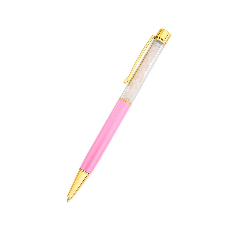 LINHA BEM ESTAR.Caneta esferográfica de tinta preta com pedras naturais em formato cascalho. Com acabamento dourado e tubo pink. Uma peça ideal para presentear e ter a energia das pedras naturais em suas mãos. Acompanha embalagem em acrílico transparente e etiqueta com QRcode para mais informações sobre o produto. É possível substituir a carga da caneta.