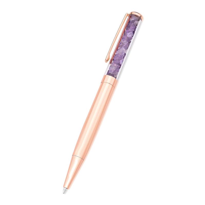 LINHA BEM ESTAR.Caneta esferográfica de tinta azul com pedras naturais em formato cascalho. Com acabamento rosê é uma peça ideal para presentear e ter a energia das pedras naturais em suas mãos. Acompanha embalagem em acrílico transparente e etiqueta com QRcode para mais informações sobre o produto. É possível substituir a carga da caneta.