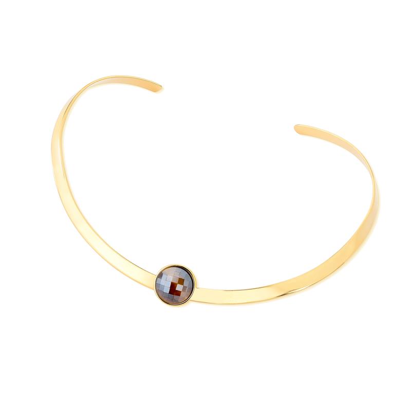 COLEÇÃO FACETADA PEROLADA. Colar composto por pingente com pedra natural facetada, com efeito perolado, no formato redonda de 12mm. Acompanha aro rígido.