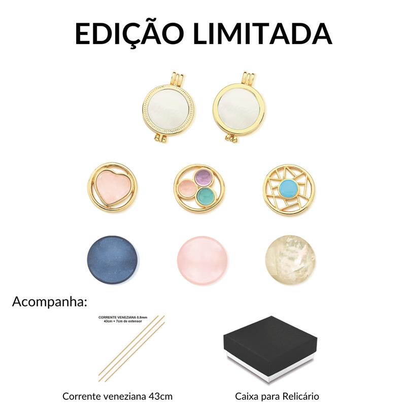 EDIÇÃO LIMITADA.Combo composto por pingente relicário com 3 medalhas e quatro pedras: medalha de coração, medalha de três pedras e medalha de trama, pedra de náutilus, madrepérola, estrela perolada e quartzo rosa perolada.