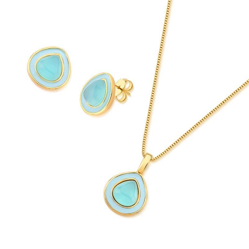 COLEÇÃO HAPPY. Conjunto é composto por brinco com pedra cabochão, no formato de gota 8,65mm. Acompanha pingente de mesma pedra. Corrente veneziana de 43cm + 7cm de extensor. Possui detalhes esmaltados em azul. Altura total do brinco: 1,6cm. Altura total do pingente: 2,3cm.