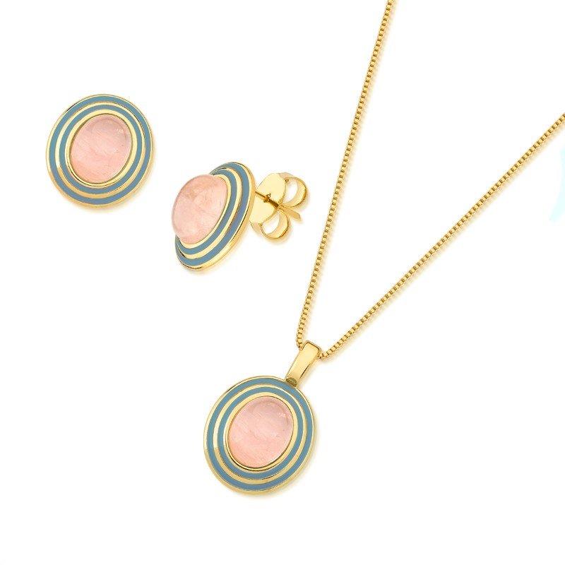 COLEÇÃO HAPPY. Conjunto é composto por brinco com pedra cabochão, no formato oval 8x10mm. Acompanha pingente de mesma pedra. Corrente veneziana de 43cm + 7cm de extensor. Possui detalhes esmaltados em azul. Altura total do brinco: 1,8cm. Altura total do pingente: 2,6cm.