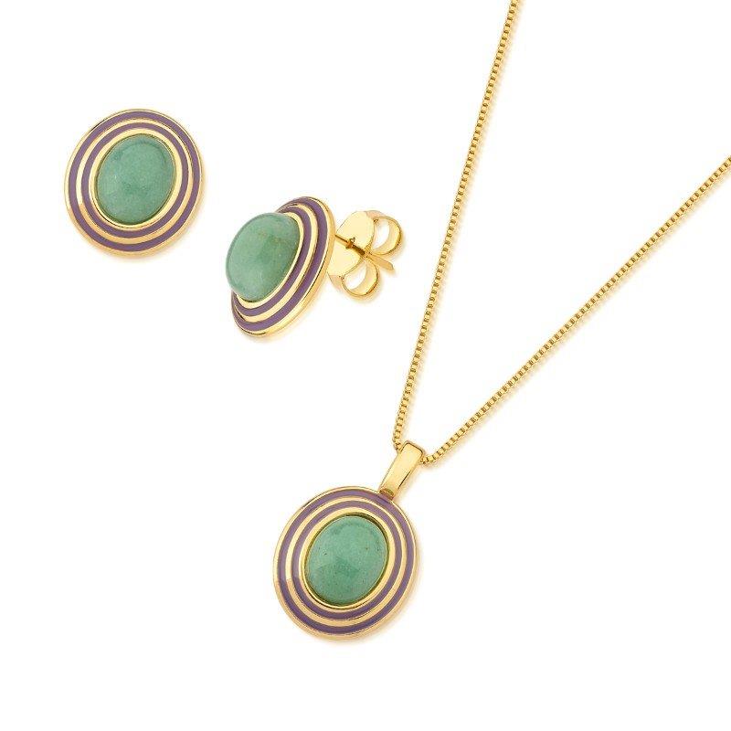 COLEÇÃO HAPPY.Conjunto é composto por brinco com pedra cabochão, no formato oval 8x10mm. Acompanha pingente de mesma pedra. Corrente veneziana de 43cm + 7cm de extensor.