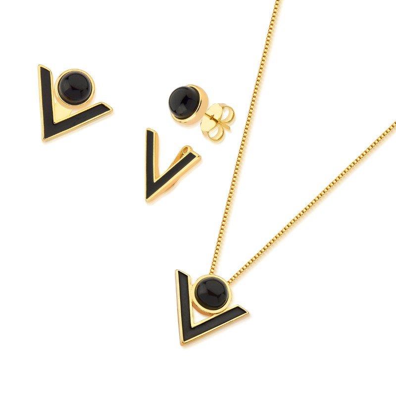 COLEÇÃO CLÁSSICOS. Conjunto é composto por brinco 2 em 1 com pedra cabochão, no formato redondo de 6,5mm. Acompanha pingente de mesma pedra. Corrente veneziana de 43cm + 7cm de extensor. Possui detalhes esmaltados em preto. Altura total do brinco: 1,7cm. Altura total do pingente: 1,7cm.