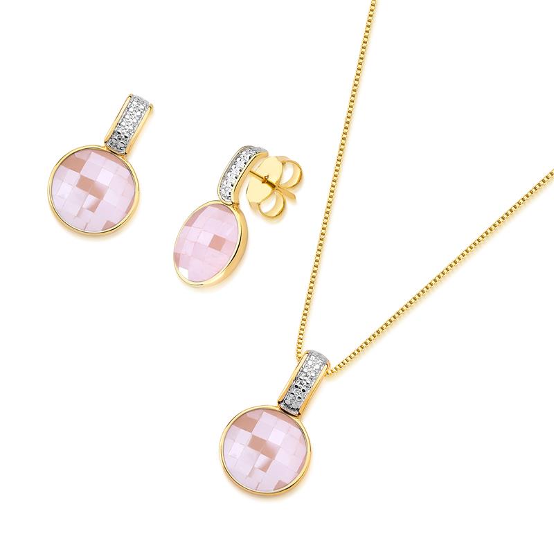 COLEÇÃO FACETADA PEROLADA.O conjunto é composto por brinco com pedra natural facetada, com efeito perolado, no formato redondo de 12mm. Acompanha pingente de mesma pedra. Possui detalhes com aplicação de caneta de ródio branco. Corrente veneziana de 43cm + 7cm de extensor.