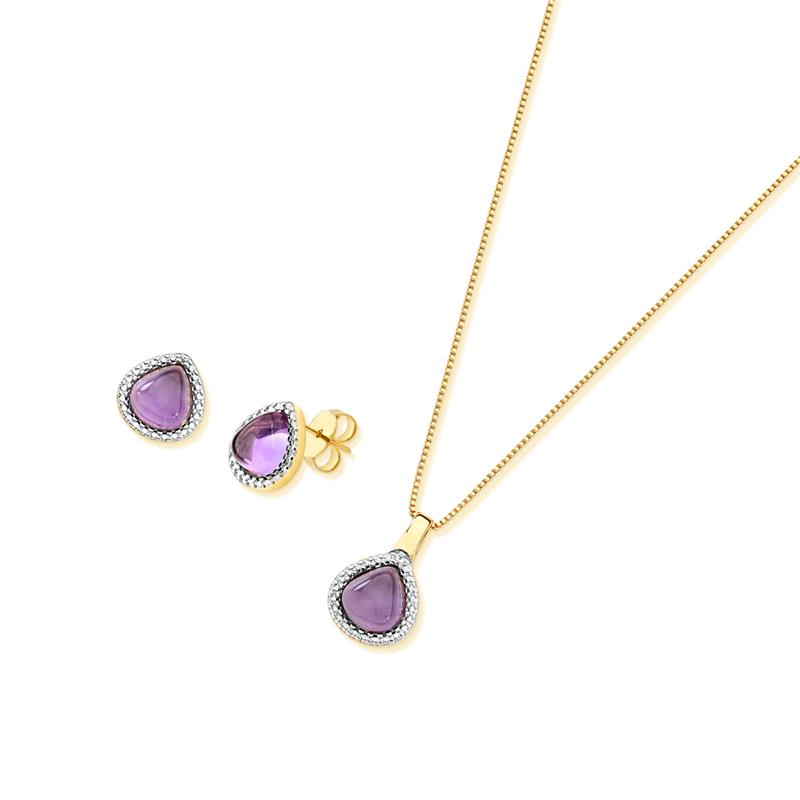 COLEÇÃO AMETISTA.Conjunto é composto por brinco com pedra cabochão, no formato de gota 8,65mm, acompanha pingente de mesma pedra. Possui textura similar a zircônia, com aplicação de ródio branco. Corrente Veneziana de 43cm + 7cm de extensor.