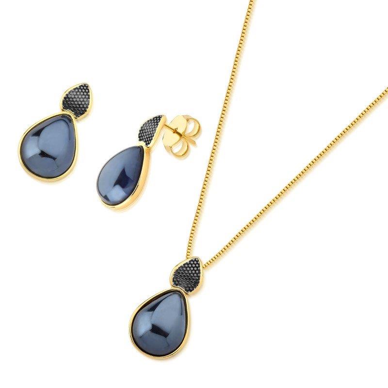 COLEÇÃO PEROLADA. Conjunto é composto por brinco folheado a ouro e aplicação de ródio negro, com pedra cabochão perolada em formato de gota 10x14mm, acompanha pingete de mesma pedra. Corrente veneziana de 43cm + 7cm de extensor. Altura total do brinco: 2,5cm. Altura total do pingente: 2,5cm.