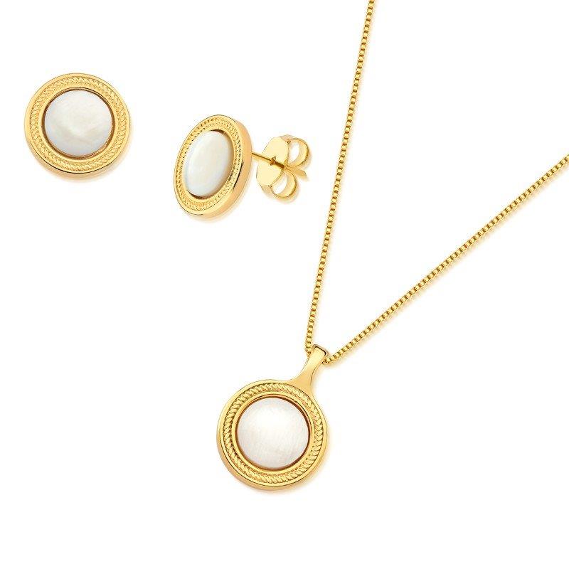 LINHA TREND, O conjunto é composto por brinco com pedra cabochão em formato redondo de 10mm, e acompanha pingente da mesma pedra. Corrente veneziana de 43cm + 7cm de extensor. Altura total do brinco: 1,5cm. Altura total do pingente: 2,2cm.