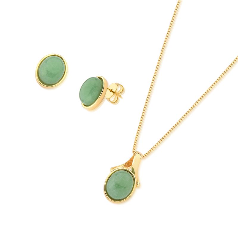 LINHA BÁSICA.Conjunto é composto por brinco com pedra cabochão, no formato oval de 8x10mm, acompanha pingente de mesma pedra. Corrente Veneziana de 43cm + 7cm de extensor.