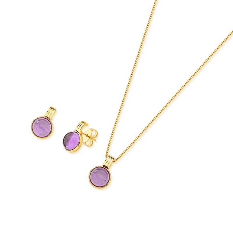 COLEÇÃO AMETISTA.Conjunto é composto por brinco com pedra cabochão, no formato redondo de 8mm, acompanha pingente de mesma pedra. Corrente Veneziana de 43cm + 7cm de extensor.