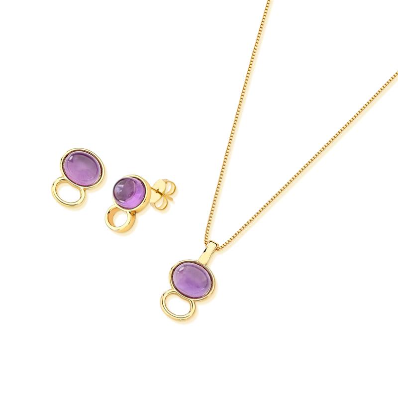 COLEÇÃO AMETISTA.Conjunto composto por brinco com pedra cabochão oval 8x10mm, acompanha pingente de mesma pedra. Corrente veneziana de 43cm + 7cm de extensor.