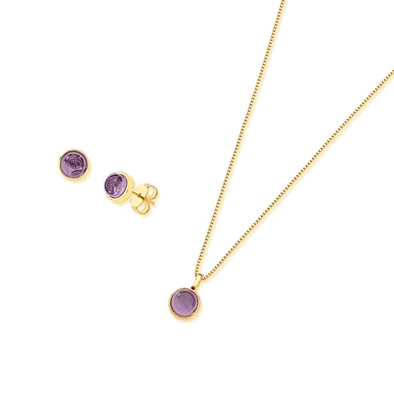 COLEÇÃO AMETISTA.O conjunto é composto por brinco com pedra cabochão redonda de 6,5mm. Acompanha pingente de mesma pedra.