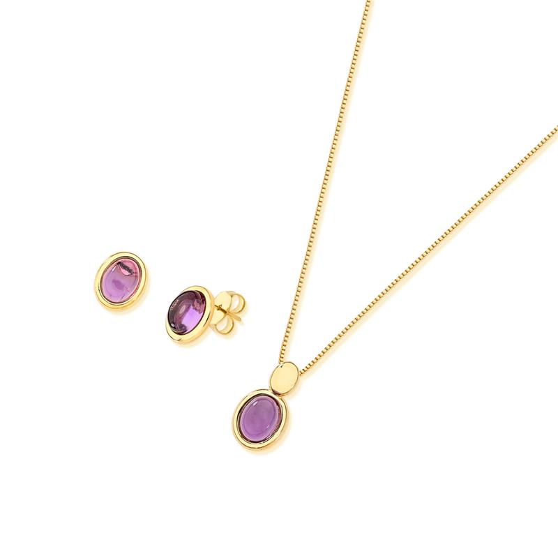 COLEÇÃO AMETISTA.Conjunto composto por brinco com pedra cabochão oval 8x6mm, acompanha pingente de mesma pedra. Corrente veneziana de 43cm + 7cm de extensor.