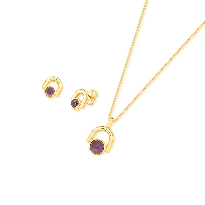 COLEÇÃO AMETISTA.Conjunto é composto por brinco com pedra cabochão, no formato redondo de 4mm, acompanha pingente com pedra cabochão, no formato redondo de 6,5mm.A pedra ametista traz o significado de sabedoria, equilíbrio, proteção, vitalidade, tem o poder acalmar emoções, simboliza a clareza e elevação espiritual. Por atuar como ponte entre o físico e o astral, a Ametista é uma pedra que pode ser usada também na interpretação de sonhos e para melhorar a nossa memória espiritual. Possui energia que auxília na tranformação e sabedoria. Corresponde ao Chakra Coronário.
