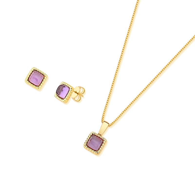 COLEÇÃO AMETISTA.Conjunto é composto por brinco com pedra cabochão, no formato quadrado 6x6mm, acompanha pingente de mesma pedra. Corrente Veneziana de 43cm + 7cm de extensor.