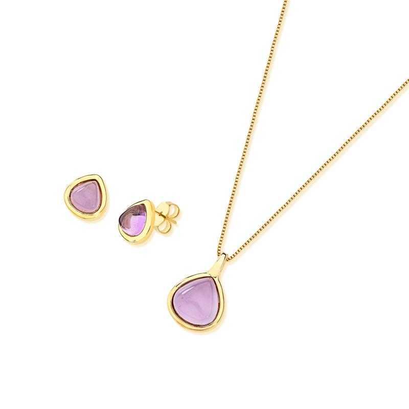 COLEÇÃO AMETISTA.Conjunto é composto por brinco com pedra cabochão, no formato de gota 8,65mm, acompanha pingente com pedra cabochão no formato de gota 12x13mm. Corrente Veneziana de 43cm + 7cm de extensor.