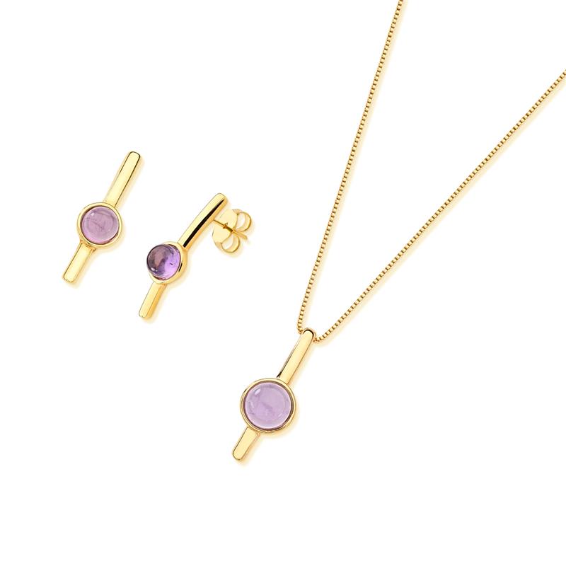 COLEÇÃO AMETISTA.Conjunto é composto por brinco com pedra cabochão no formato redonda de 6,5mm, acompanha pingente com pedra cabochão no formato redonda de 8mm. Corrente veneziana de 43cm + 7cm de extensor.