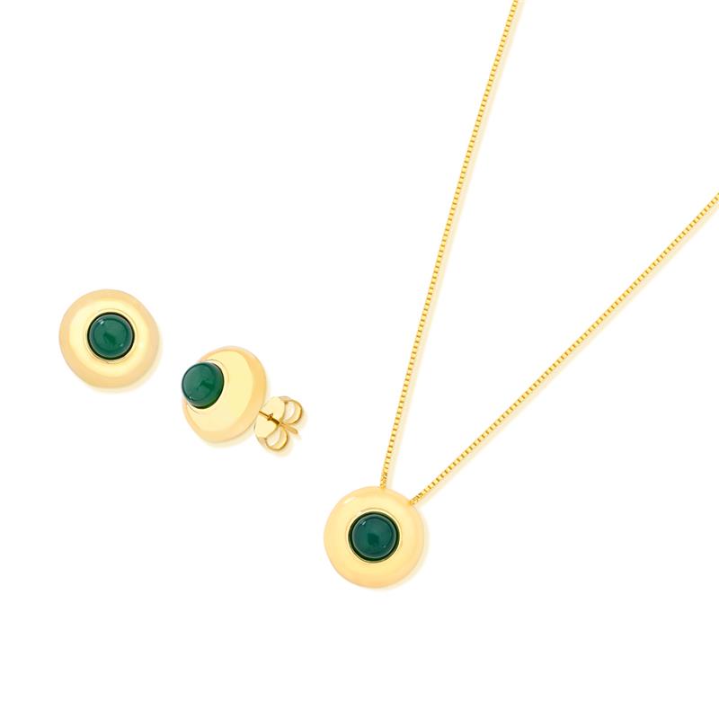COLEÇÃO BOLD.Conjunto é composto por brinco com pedra cabochão, no formato redondo de 6,5mm, acompanha pingente de mesma pedra. Corrente Veneziana de 43cm + 7cm de extensor.
