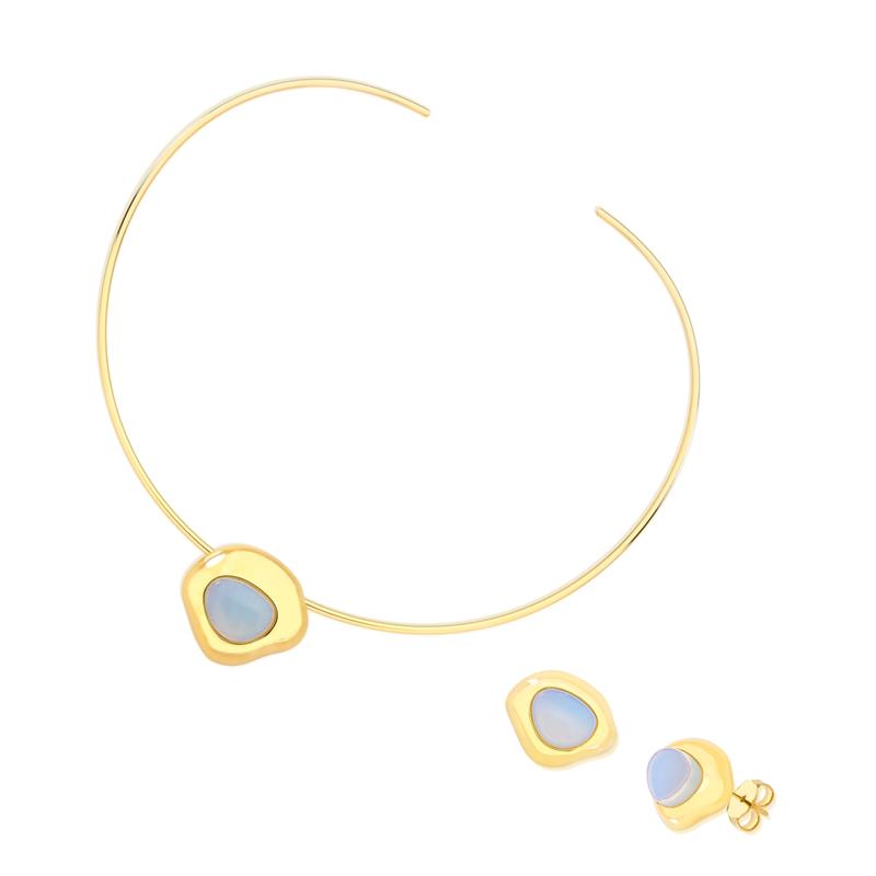COLEÇÃO BOLD.Conjunto é composto por brinco com pedra cabochão, no formato escudo de 12x15mm, acompanha pingente cabochão de mesma pedra. Com aro rígido, sem extensor. Inspirada nas formas curvas das artes plásticas e design, volumes e formatos orgânicos do corpo feminino, a coleção é colorida leve e super atual, combina peças delicadas com peças marcantes. Apaixone-se e crie vários looks.