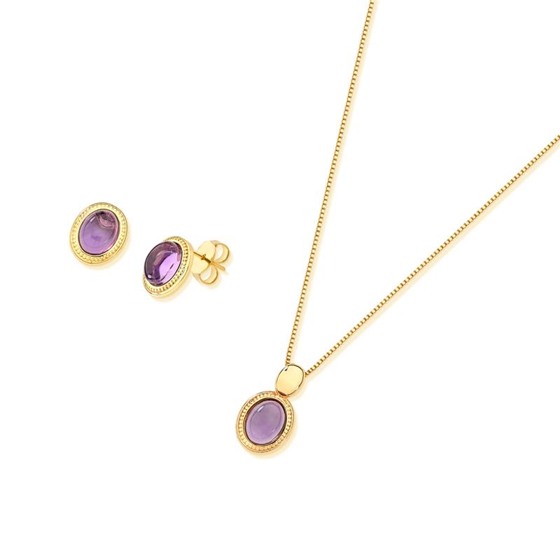COLEÇÃO AMETISTA.Conjunto composto por brinco com pedra cabochão oval 8x6mm, acompanha pingente de mesma pedra. As peças possuem uma delicada textura em seu entorno. Possui corrente veneziana de 43cm + 7cm de extensor.