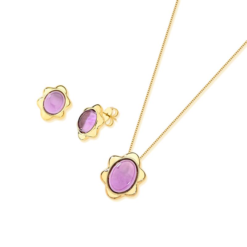 COLEÇÃO AMETISTA.Conjunto é composto por brinco com pedra cabochão, no formato oval 8x10mm, acompanha pingente com pedra cabochão no formato oval 11x15mm. Corrente Veneziana de 43cm + 7cm de extensor. O metal possui detalhes que lembram uma delicada flor, tornando-se uma peça especial e diferenciada no seu mix de vendas!
