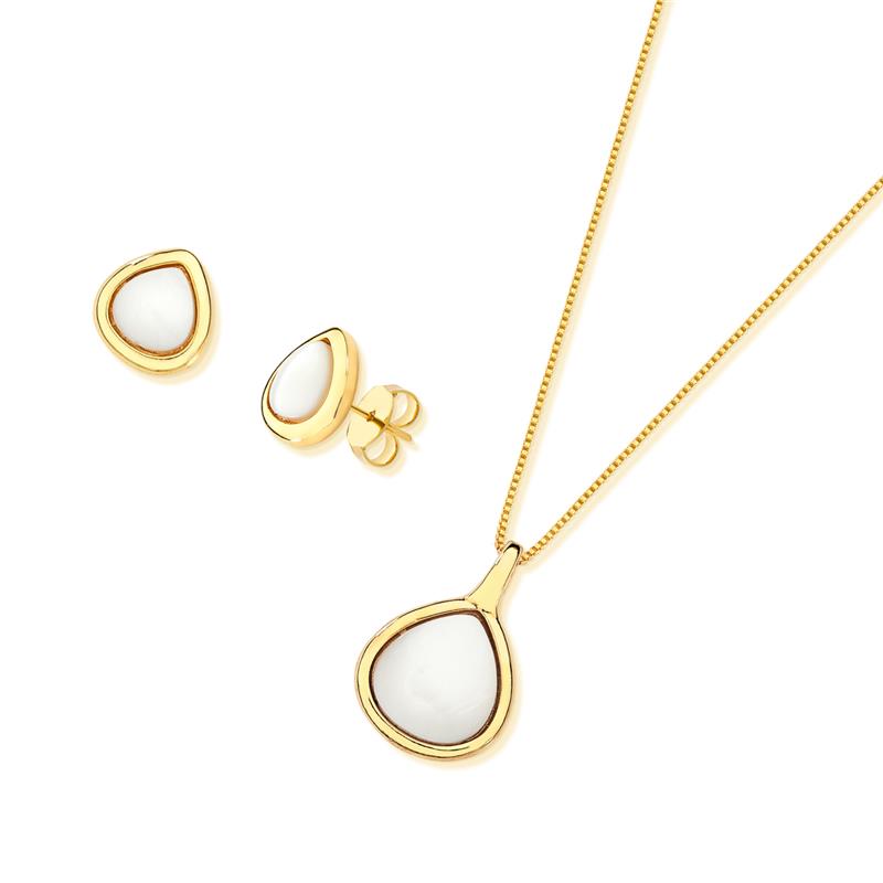 LINHA BÁSICA.Conjunto é composto por brinco com pedra cabochão, no formato de gota 8,65mm, acompanha pingente com pedra cabochão no formato de gota 12x13mm. Corrente Veneziana de 43cm + 7cm de extensor.