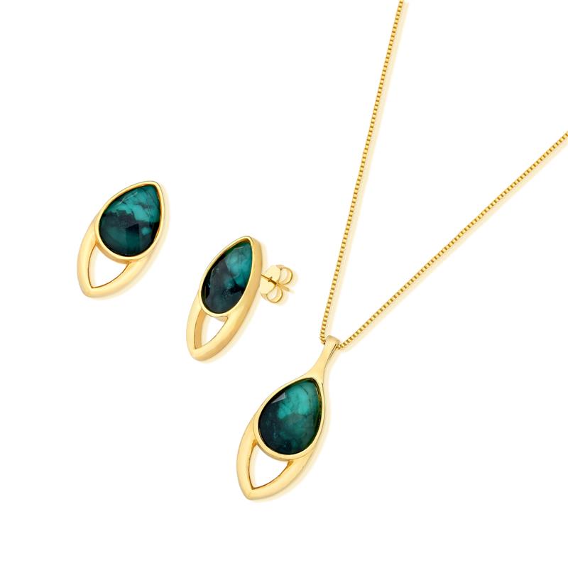 COLEÇÃO ESMERALDA. Altura do brinco: 2,6cm. Altura do pingente: 3,3cm. Tamanho do colar: 43cm + 7cm de extensor. Tamanho da pedra: gota facetada 10x14mm.