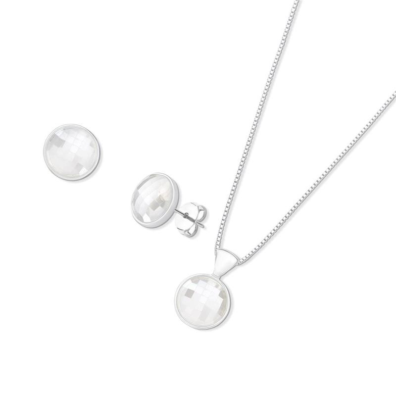 COLEÇÃO FACETADA PEROLADA.O conjunto é composto por brinco com pedra natural facetada, com efeito perolado, no formato redondo de 12mm. Acompanha pingente de mesma pedra. Corrente veneziana de 43cm + 7cm de extensor.