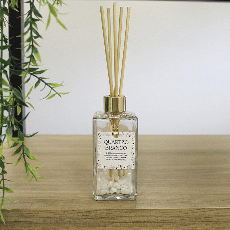 Nosso difusor de ambiente é de vidro e possui pedras naturais em seu interior, de formas e tamanhos irregulares.