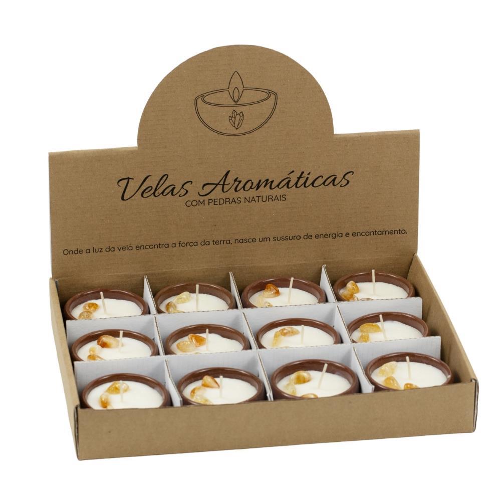 KIT DE VELAS AROMÁTICAS DE CITRINOKit composto por 12 unidades de velas aromáticas com pedra naturais de citrino e seu aroma é de flor de laranjeira.