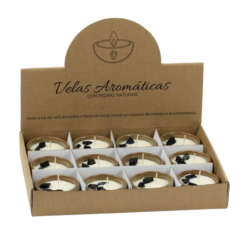 KIT DE VELAS AROMÁTICAS DE TURMALINA NEGRA.Kit composto por 12 unidades de velas aromáticas com pedra naturais de turmalina negra e seu aroma é de canela.