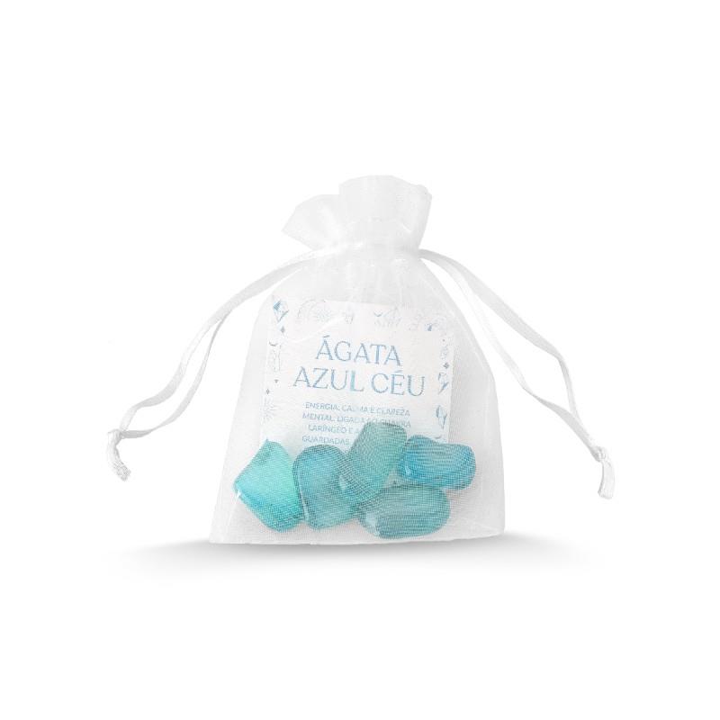 KIT ENERGÉTICO ÁGATA AZUL CÉU. Possui energia que auxília na calma e clareza mental. Ligado ao Chakra Laríngeo e as emoções guardadas. Representa o poder de comunicação. O kit é composto por 5 pedras de Ágata Azul Céu, que variam de 1,1cm a 2,5cm. Acompanha tag e embalagem de organza.