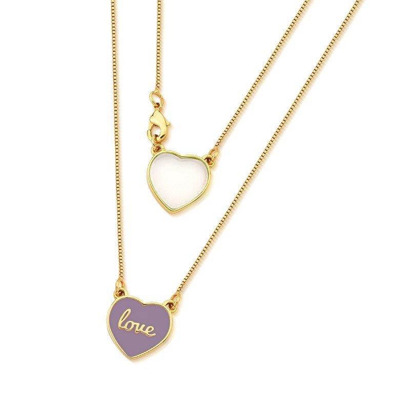 COLEÇÃO HAPPY. Pingente com pedra em formato de coração 12x13mm com medalha escrito ''LOVE''. Acompanha corrente veneziana de 92cm no total, possibilitando usá-la dupla no pescoço. Possui detalhes esmaltados em lilás.